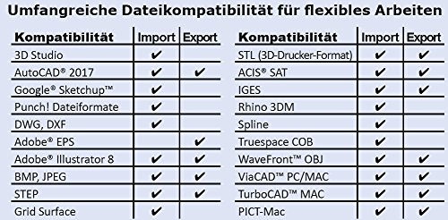 - Unterstützt über 19 Dateiformate wie STL, STEP, DWG, DXF, SketchUp, ACIS SAT, IGES, Rhino 3DM, 3D Studio, AutoCAD 2017 (DXF/DWG) und viele weitere (siehe Import/Export-Tabelle für Details)